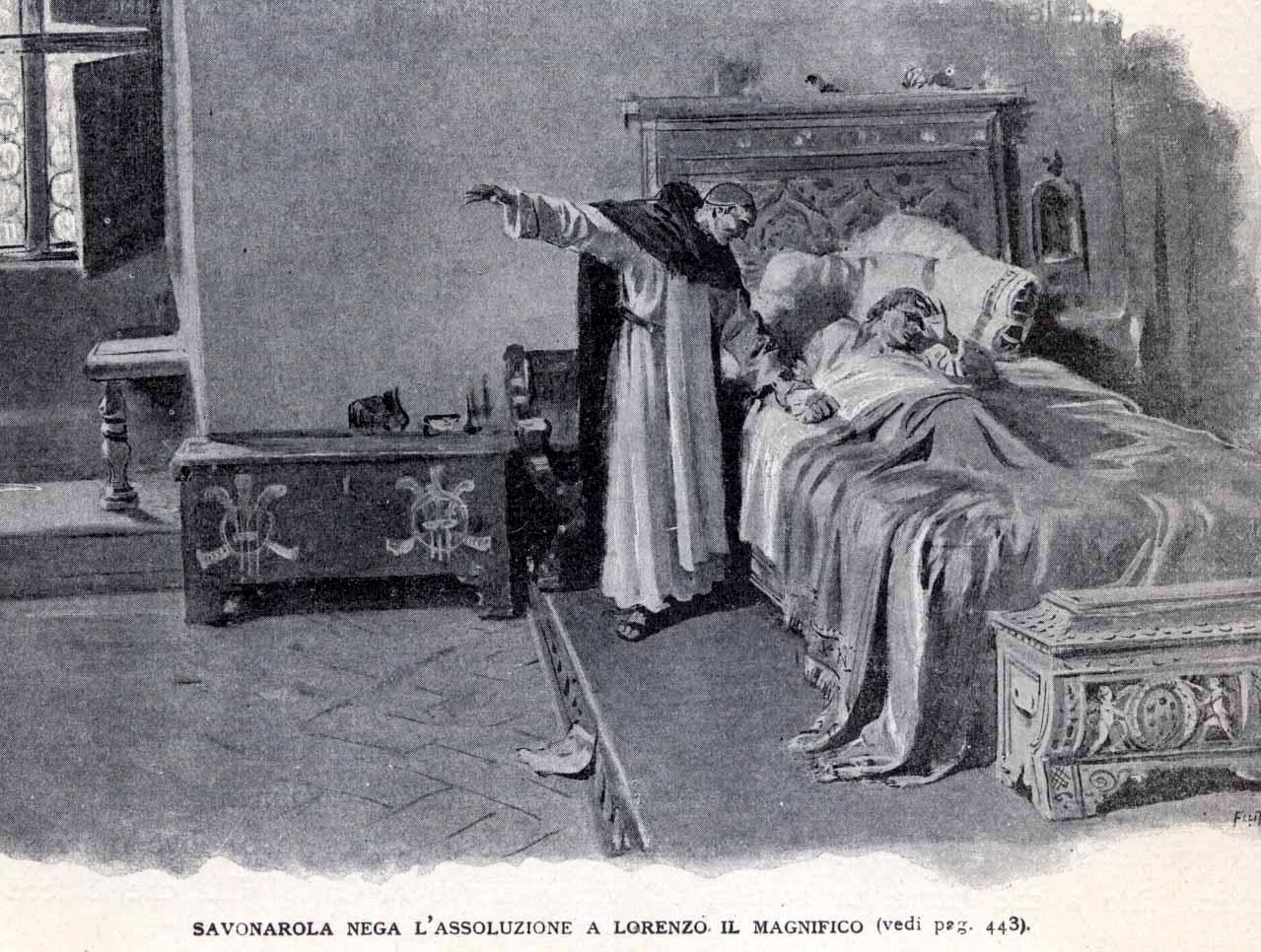 On 1 August of the same year the latter went to the pulpit and launched a deluge of complaints against the Medici, the papacy and all Christianity. The Florentines, who had probably grown tired of a whole series of situations, listened with great participation to his appeals to asceticism and his appalling prophecies, including the imminent death of the "tyrant".