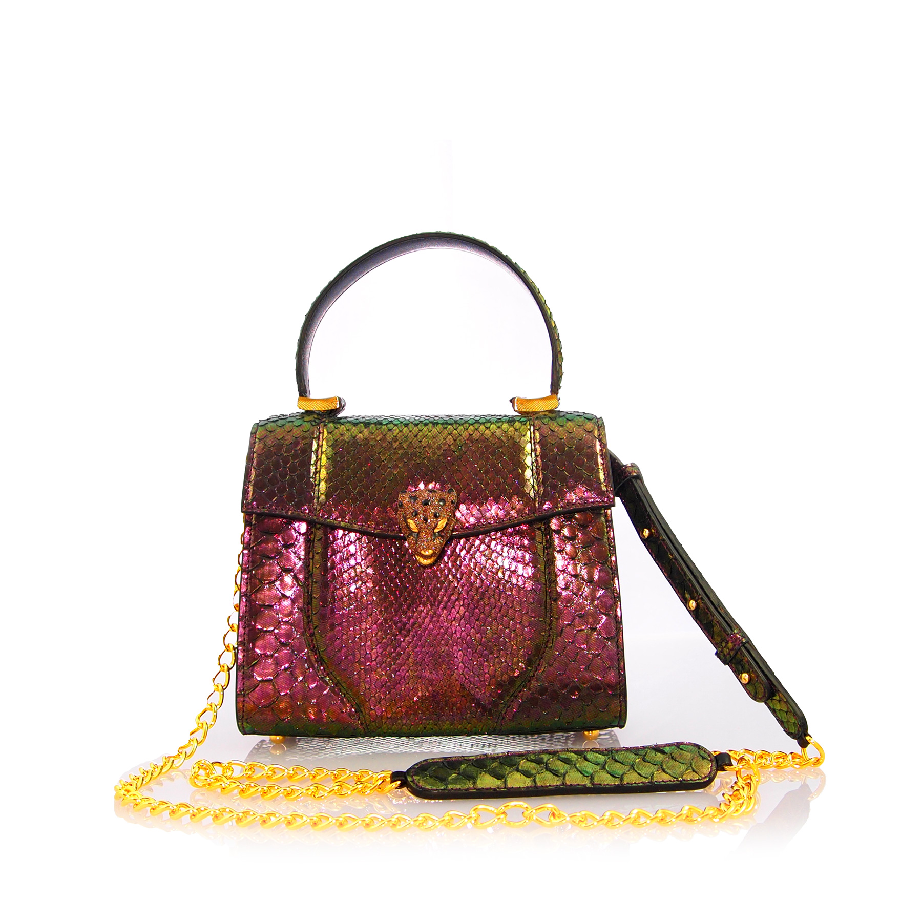 Borsa pregiata in vera pelle di pitone cangiante, i metalli sono tutti realizzati a mano. Le finiture sono in oro e la fodera è in vera pelle.